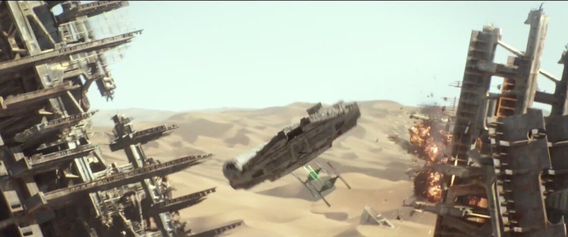Segue-se um clip da Millennium Falcon a ser perseguida em Jakku por TIE fighters, e os fãs recebem aquilo que queriam desde Abril – mais Han Solo. «É verdade, tudo», diz o velho contrabandista, parecendo triste e assombrado, a espreitar através de um holograma planetário, quando Rey traz à baila o tópico de «histórias sobre o que aconteceu.»