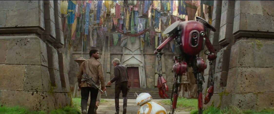 E entre eles os dois vêm-se planos lindos e misteriosos que passam quase demasiado rápido para se perceber a primeira vez que se vê o trailer – como este, em que Finn, Rey, Han e BB-8 entram no que parece ser uma versão alucinógena de um templo Tibetano, com bandeiras de oração e guardado por um robô vermelho.