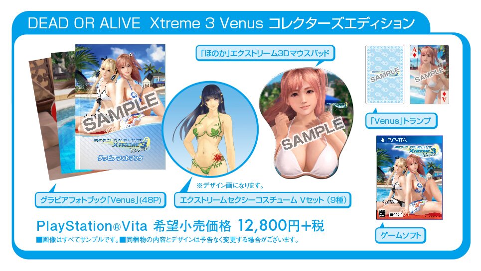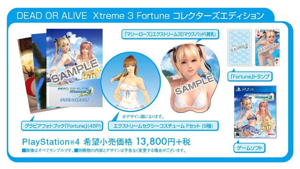 A Tecmo Koei lançou imagens do conteúdo de colecionador para Dead Or Alive Xtreme 3. Tal como o Cubo já vos deu a conhecer, o jogo terá lançamento no Japão para Playstation 4 com os subtítulos Fortune e Venus, e para a versão PSvita a 25 de Fevereiro.