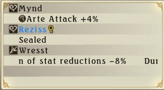 Repararam naqueles números ao lado das skills? Esses números indicam que podemos emparelhar, e com estes podemos receber bónus de emparelhamento aumentando as nossas capacidades de combate. Um dos mais importantes é o Blasst, no qual se juntarmos 3 skills iguais, podemos obter mais uma barra de BG (Blast Gauge), vital para Armatizations e Mystic artes. No entanto, imaginem esta situação: temos três skills Reziss, mas ao equiparmos outro equipamento com mais 2 Reziss ficamos no total com 5 Reziss. Neste caso, a skill Blasst perde-se, e ficamos com a skill Asterisk, que dá a capacidade de em cada combo, ao atingirmos os dez, vinte ou trinta golpes, desferir o dobro do dano.