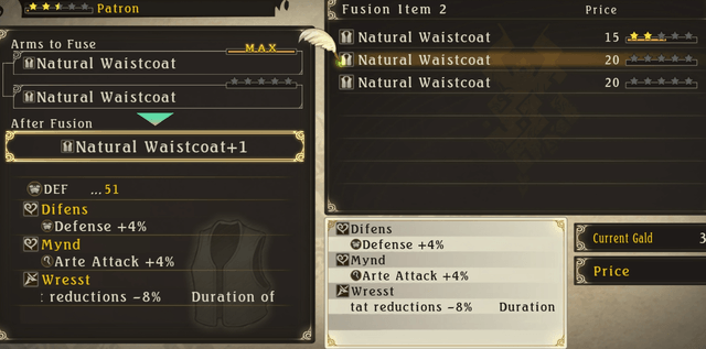 Primeiro vamos referir as regras básicas quando fundimos equipamento. Obviamente precisamos de Gald (dinheiro próprio do jogo). Só podem ser fundidos equipamentos iguais e da mesma classe, por exemplo, o Natural Waistcoat, só pode ser fundido com outro Natural Waistcoat, visto ser da mesma classe e são ambos protecções para o tronco. Ao fundir, as slots vazias de um equipamento ficam preenchidas com as skills presentes no outro equipamento que fundimos. Por exemplo, se um dos Natural Waitscoats tem a segunda slot vazia, e no outro temos a skill Wresst, essa segunda slot fica imediatamente preenchida com essa habilidade. Ao fundirmos equipamento o seu poder aumenta, ou seja, se o Natural Waistcoat tem 40 pontos de defesa, ao fundirmos com outro ficamos com, um supor, 45 pontos de defesa. Para finalizar as regras base, cada equipamento pode ser fundido até 99 vezes, aumentando o seu poder dramaticamente. Quando fundimos certas skills e entram em contacto umas com as outras, aí é que tudo começa a ficar muito complicado, e exige muita da vossa atenção, se querem tirar total partido deste complexo, mas bem empregue, sistema de progressão de personagens.