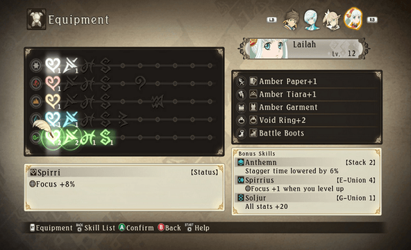 Existem várias coisas a ter em conta aqui. A primeira é a chamada G-union, na qual se tivermos skills presentes no nosso equipamento criando uma linha vertical, todos os nossos atributos ganham um bónus de mais vinte pontos, se referirem-se aos battle stats claro.