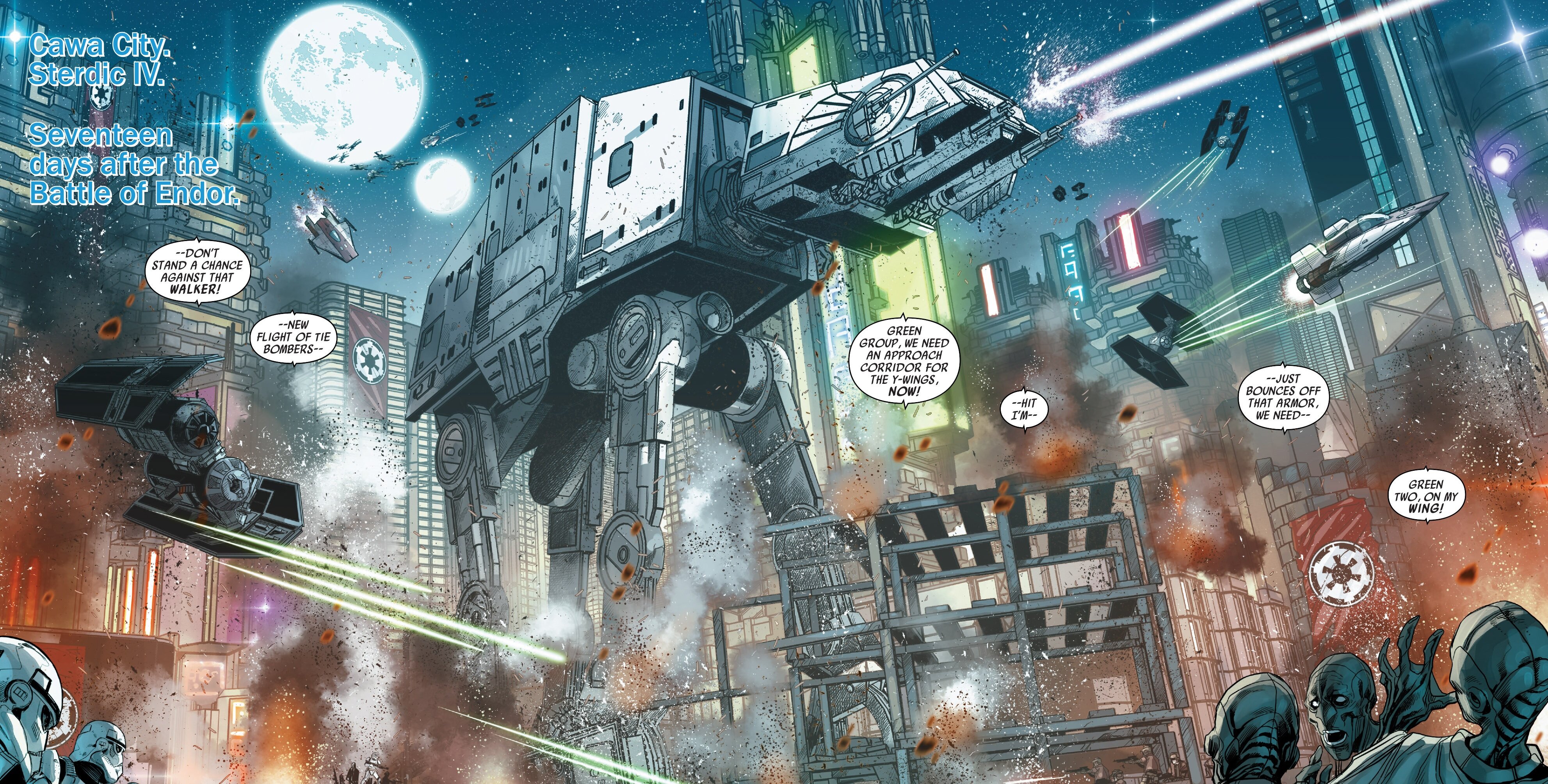Felizmente, o imenso diálogo deste fascículo é balançado com oito páginas com clássicas cenas de ação Star Wars, envolvendo TIE Fighters, Y-wings, AT-AT walkers e o esquadrão de A-wings de Bey.