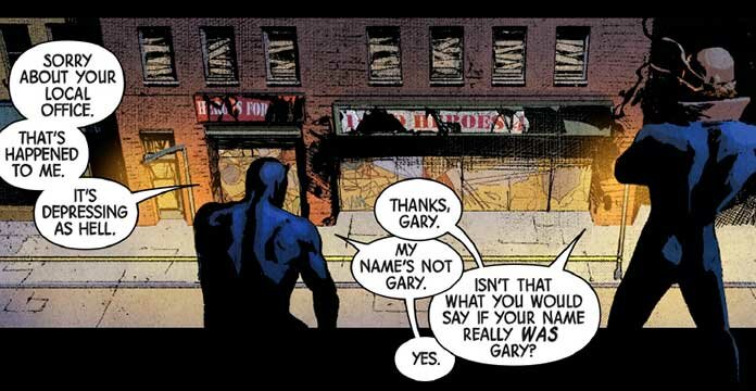 Os diálogos continuam muito bons. Na minha humilde opinião, este têm sido um dos pontos altos destes cinco números: diálogos dinâmicos, mas não em demasia, e as personagens bem representadas. Consegue-se sentir a intimidade de Jessica Jones e Luke Cage, e continua a piada recorrente da possibilidade de o nome verdadeiro do Demolidor ser Gary. Algo que aparece frequentemente são referências a histórias individuais de cada personagem. Consegues adivinhar qual é a da imagem ali em cima? Uma pista: Frank Miller ehehe…