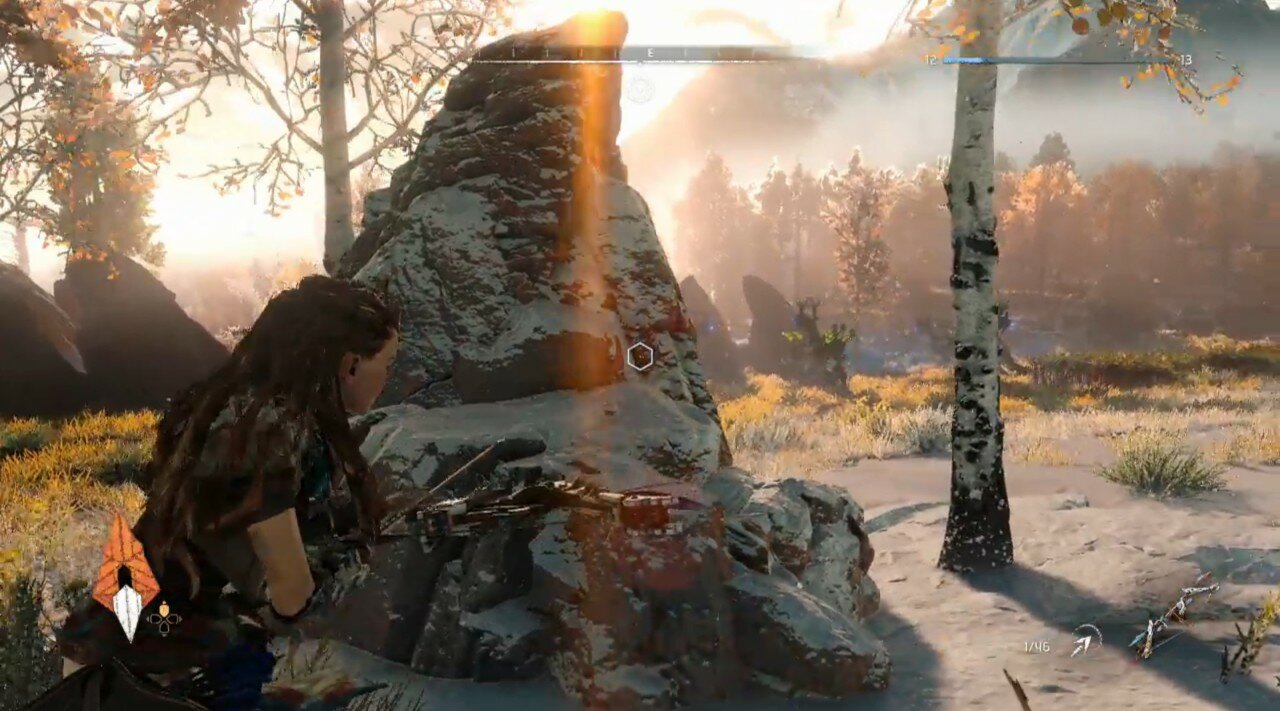 Tudo estava bem até a Aloy acordar um Thunderjaw que descansava ali perto, uma espécie de Tiranoussauro Rex robótico. É aqui que duas mecânicas muito importantes vêm ao de cima. O usar as próprias armas contra inimigos, e o atacar os pontos fracos quando expostos. Até Mark Norris fez referência a uma célebre e embaraçosa citação proferida durante a apresentação da Sony E3 de 2006.